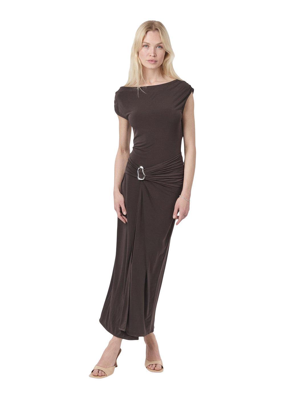 Denne kjole fremhæver din figur med sit slim fit og elegante detaljer. Den er ideel til festlige lejligheder, hvor du ønsker et sofistikeret og stilfuldt look i en dyb, brun nuance.