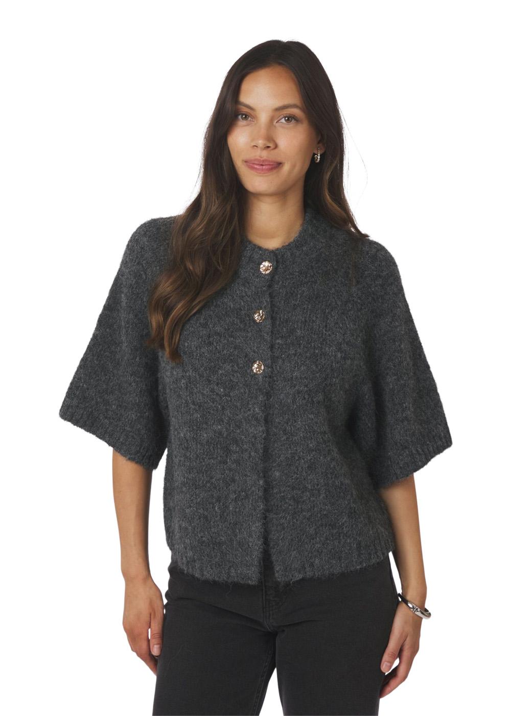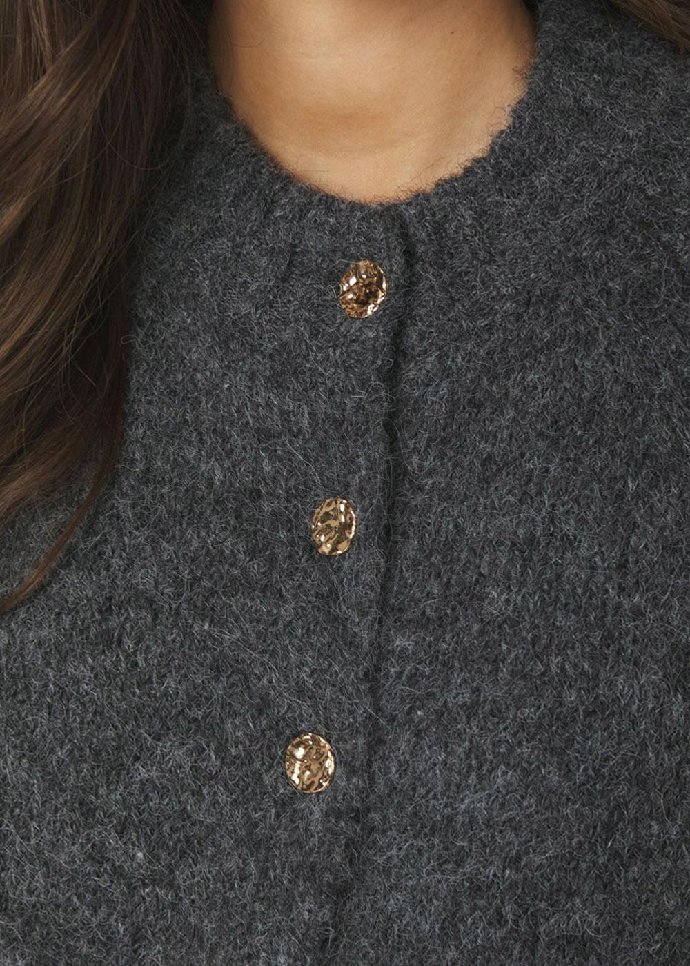 Boxy strik cardigan med vidde på ærmerne og smukke knapper foran. Kvaliteten er lækker blød og har et fluffy udtryk. Modellen er 176 cm og er iført størrelse 36.