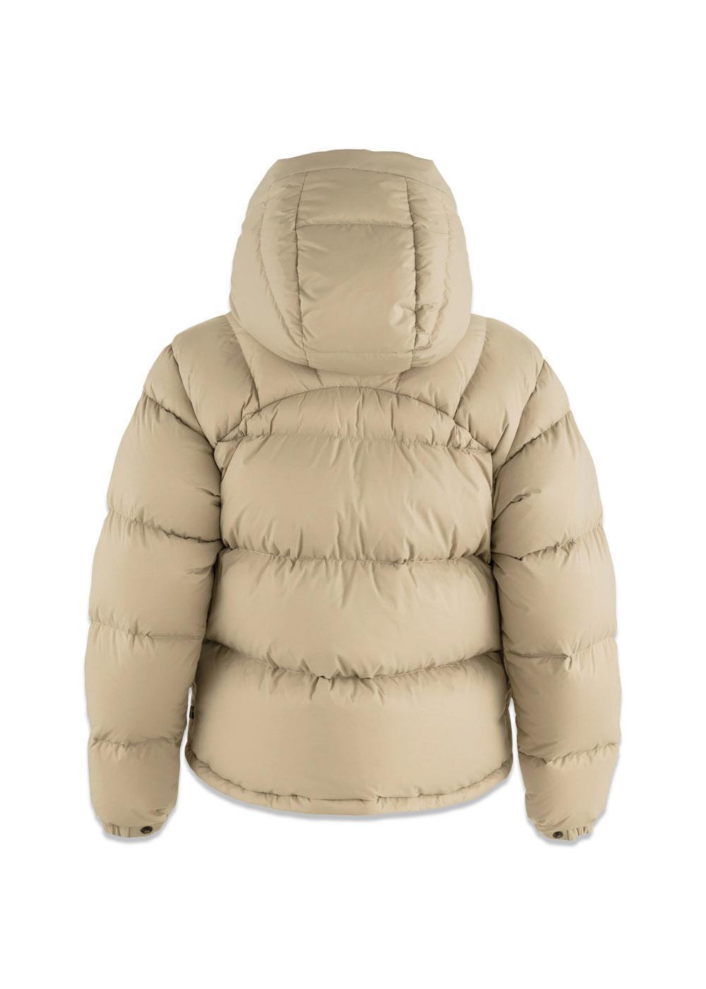 Denne dunjakke kombinerer varme og retrostil. Den korte, boxy pasform giver et moderne udtryk, der er ideelt til både hverdagsbrug og aktive dage, mens den faste hætte og lommerne tilføjer funktionalitet.