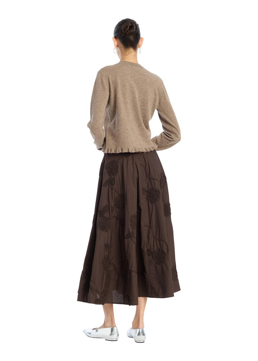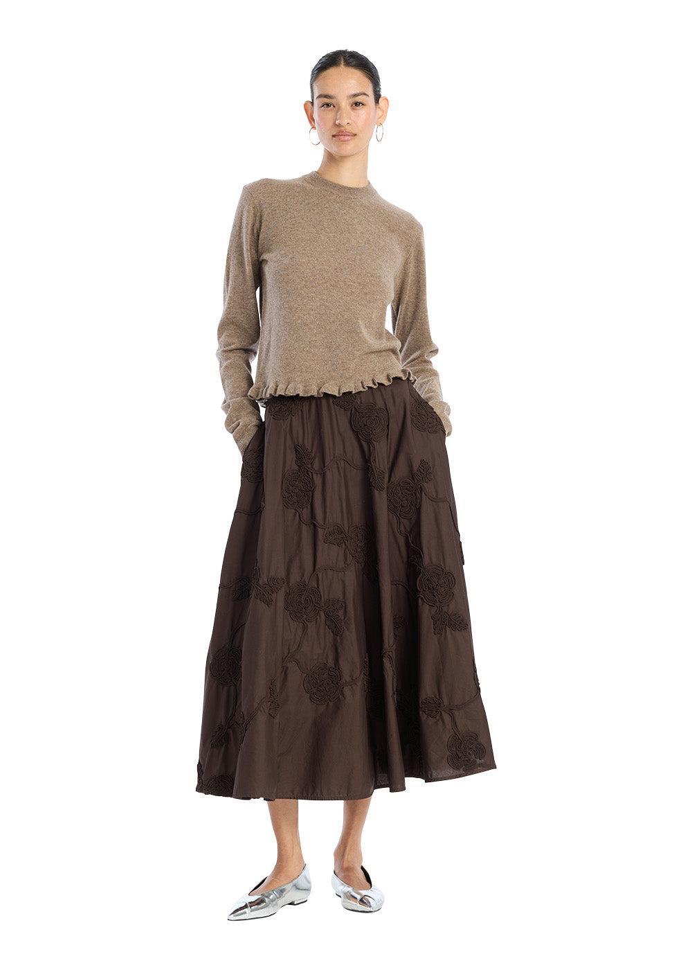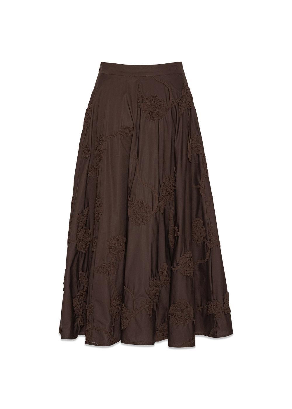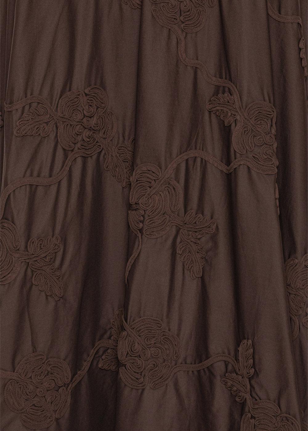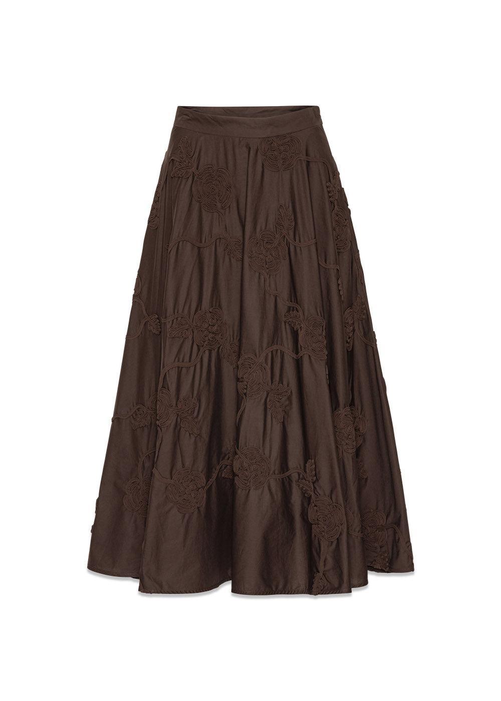 Flower Maxi Skirt fra Rotate er en elegant, A-formet nederdel i en dyb brun farve. Den er designet med et smukt, tone-i-tone blomsterbroderi, der giver et unikt og boheme-inspireret udtryk.