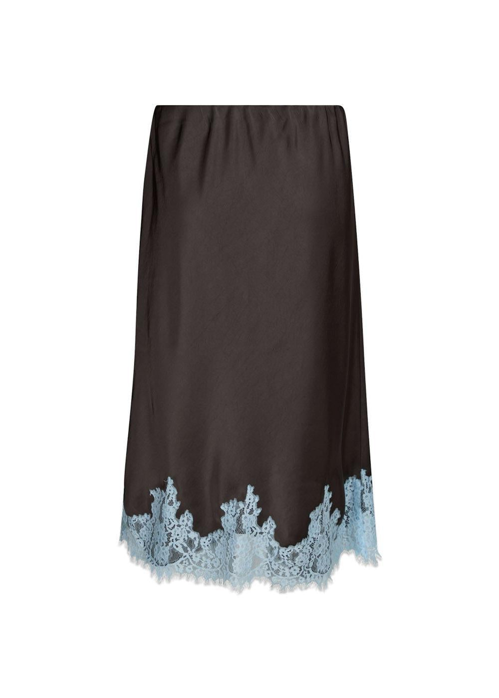 De Naira Lace Skirt is een donkerbruine midi-rok met een contrasterende lichtblauwe kanten bies aan de onderkant. De rok is schuin gesneden en heeft een interne elastiek in de taille voor een eenvoudige pasvorm.