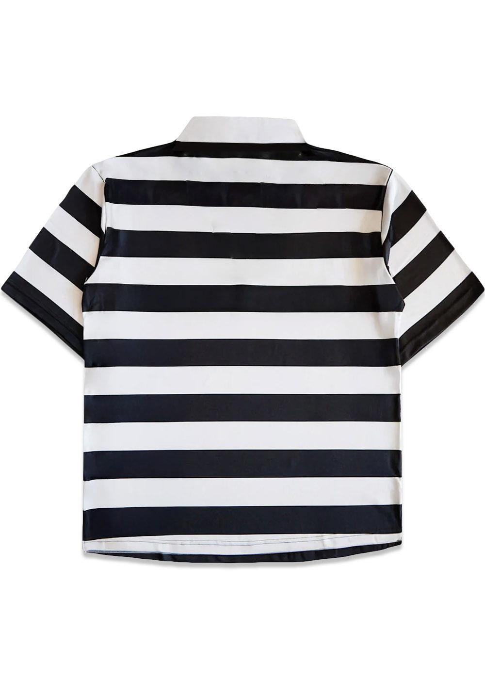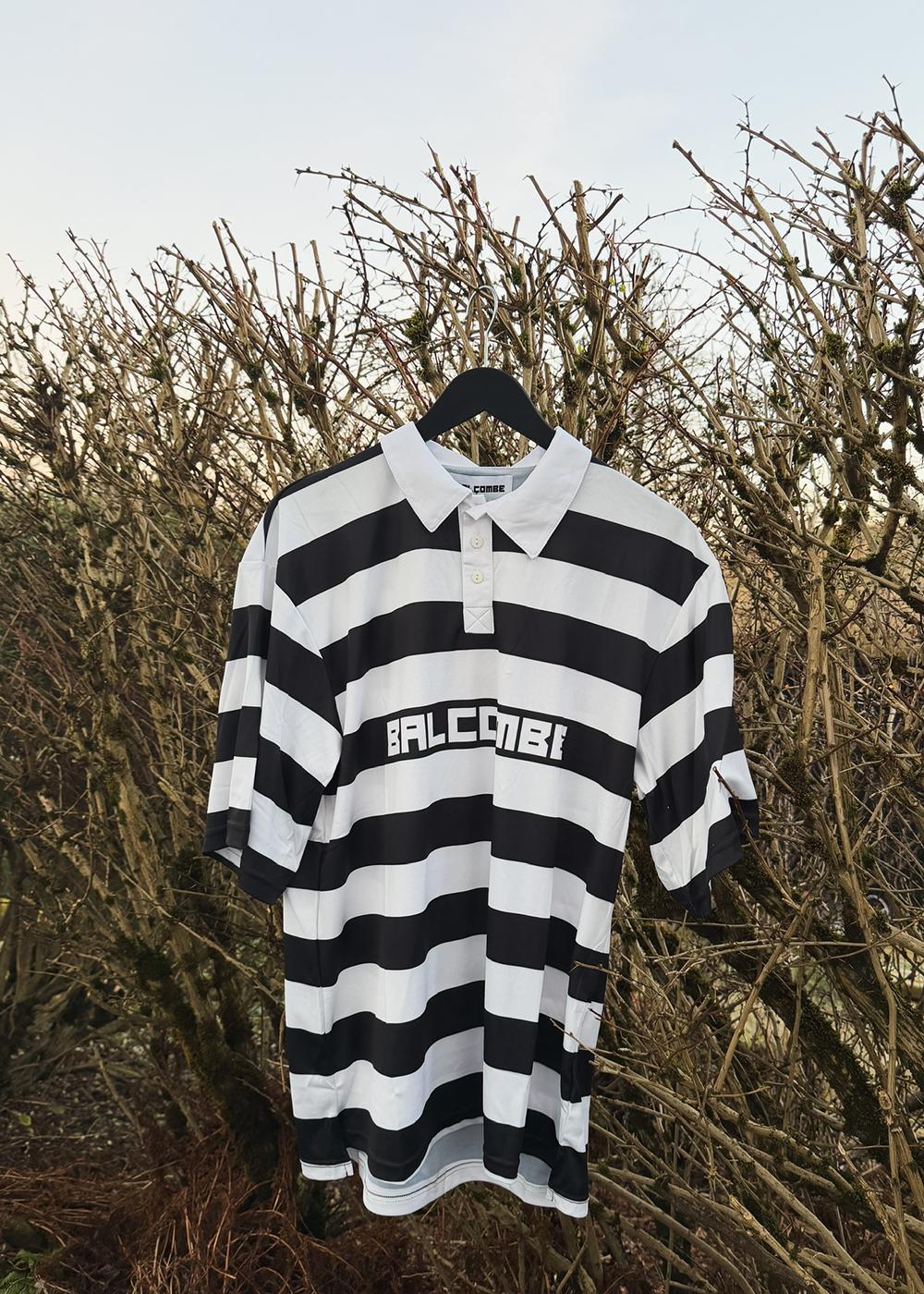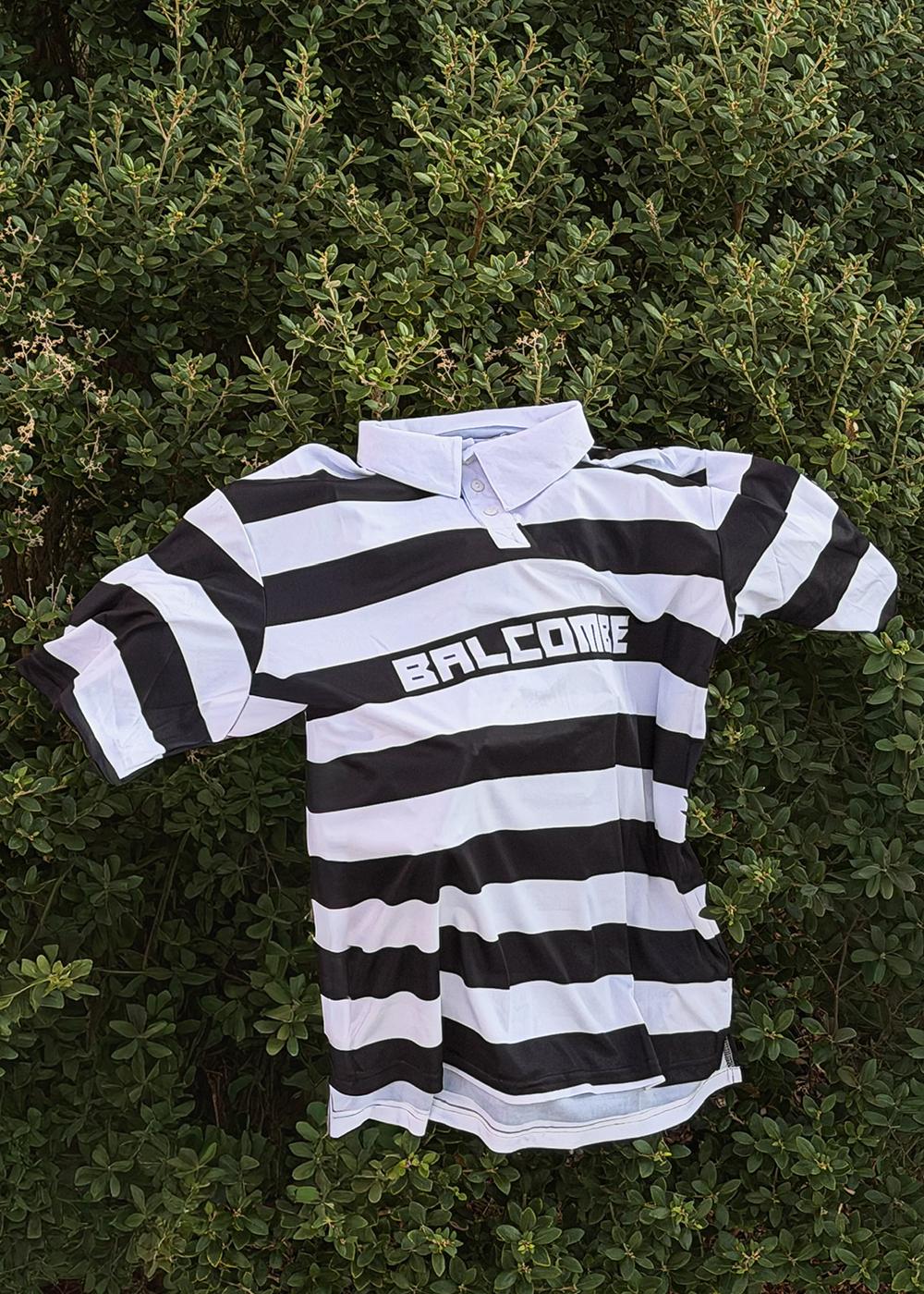 Dit poloshirt van BALCOMBE heeft een opvallend gestreept patroon in zwart en wit. Het heeft een klassieke polokraag en een gedrukt logo op de borst voor een moderne streetwear-look.