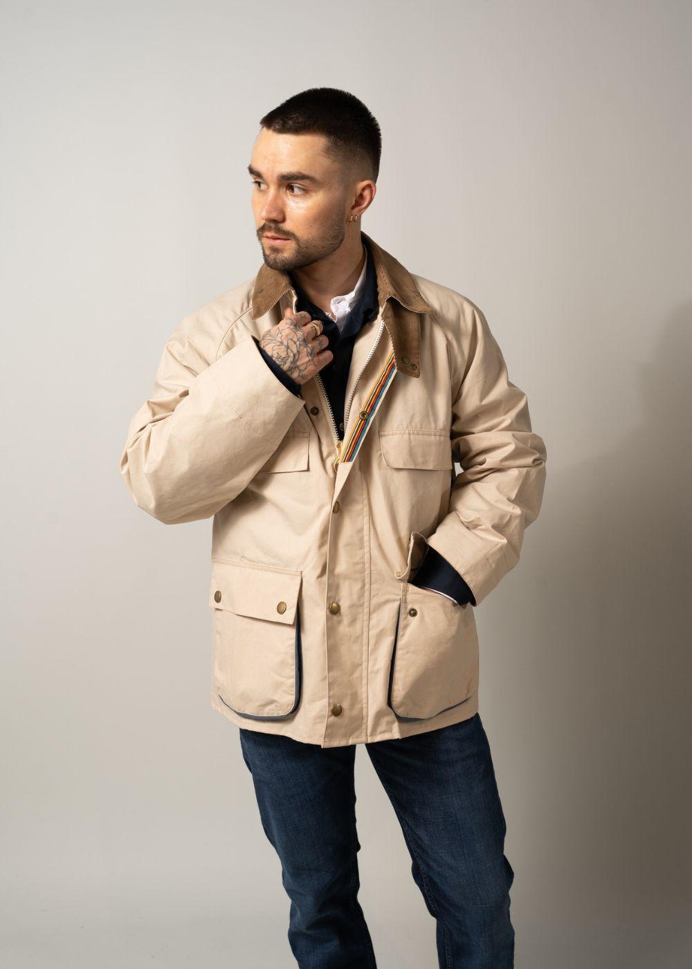 Barbour PS Bedale is een lichte tussenjas in de kleur Oatmeal. De jas heeft contrasterende details op de zakken en onderarmen, een fluwelen kraag en een verborgen postsluiting met fotoprint die klassiek design combineert met persoonlijke details.