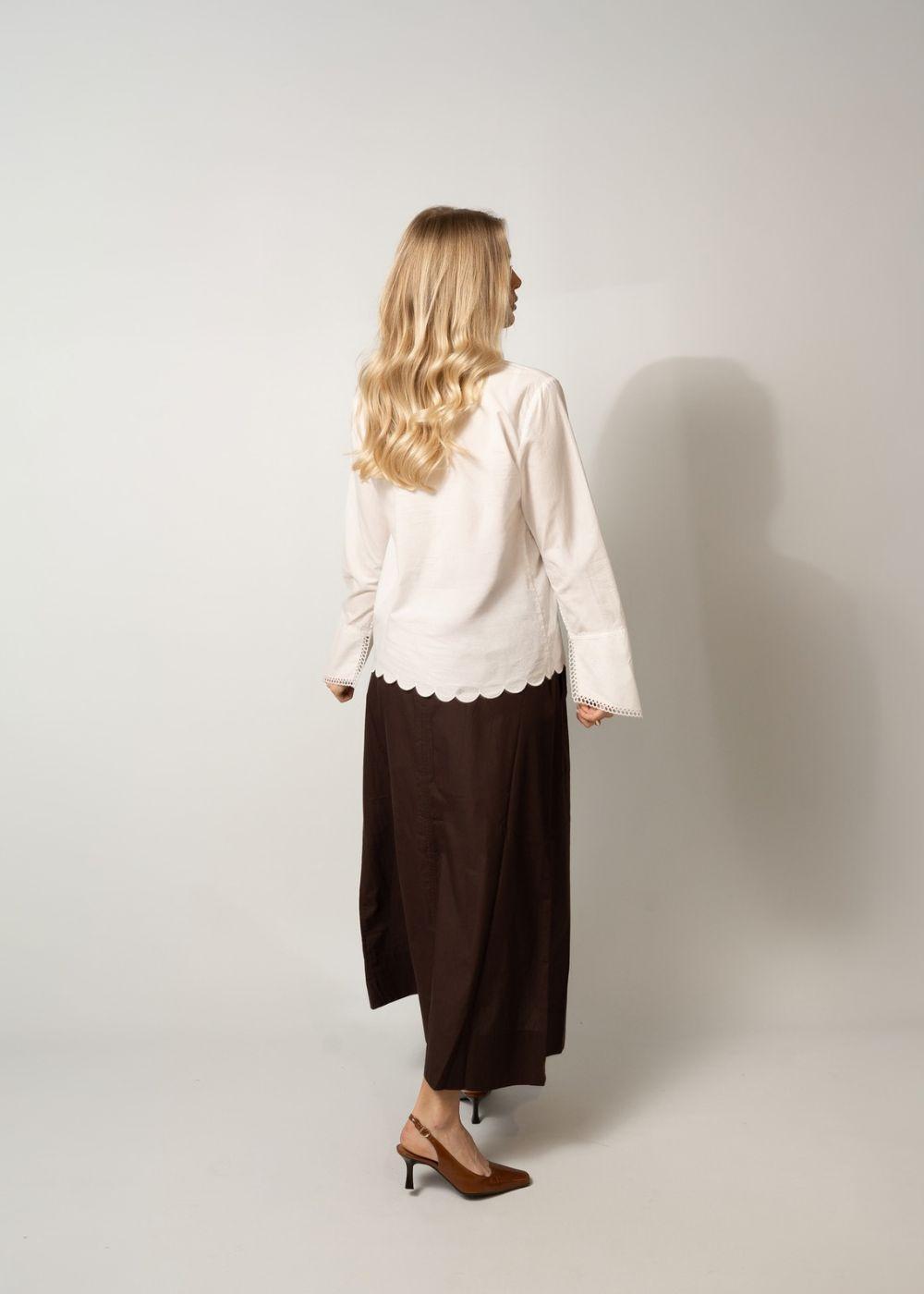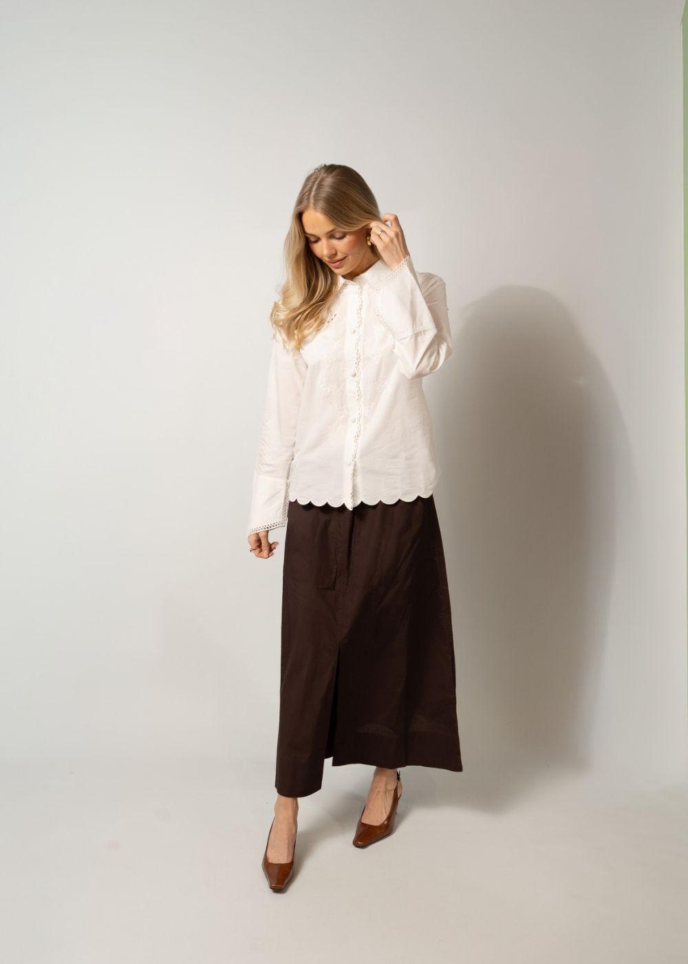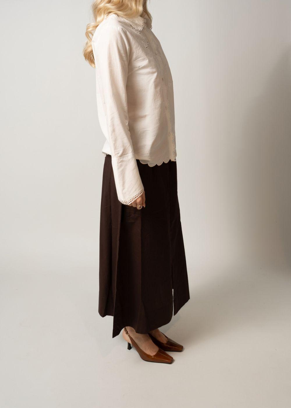 AGADIR is een losvallende rok in de kleur Figue. Het heeft een elastische taille met trekkoord, praktische zakken en een split aan de voorkant die bewegingsvrijheid geeft in een klassiek ontwerp.