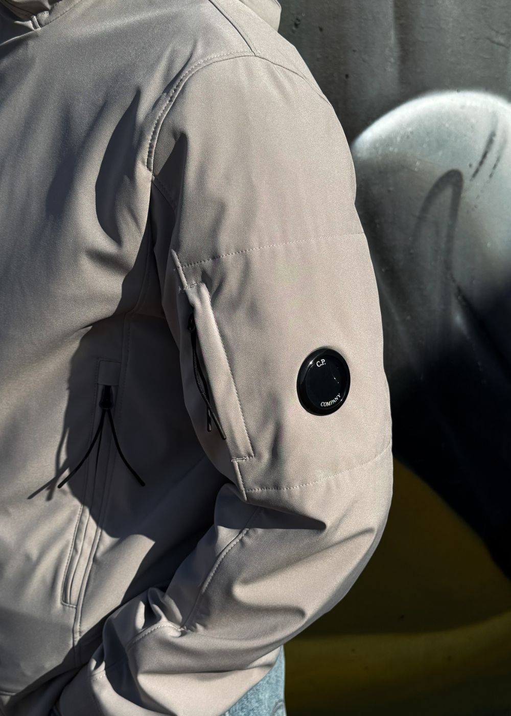 De Shell-R Hooded Lens Jacket is een functionele tussenjas in de kleur Dove. De jas heeft een hoge halslijn met vaste capuchon, een ritssluiting over de volledige lengte, opvallende snijlijnen en een lensdetail op de linkermouw.