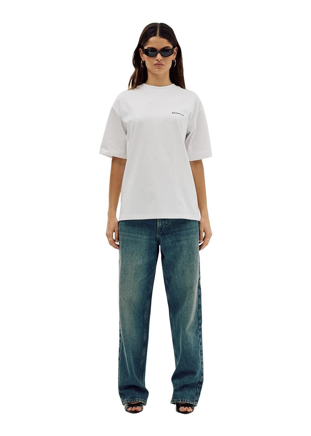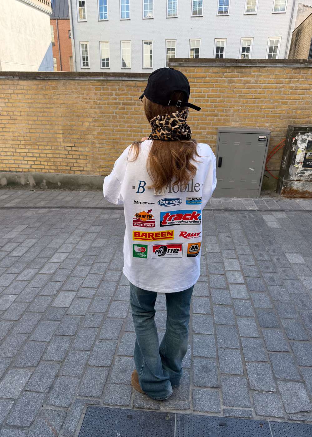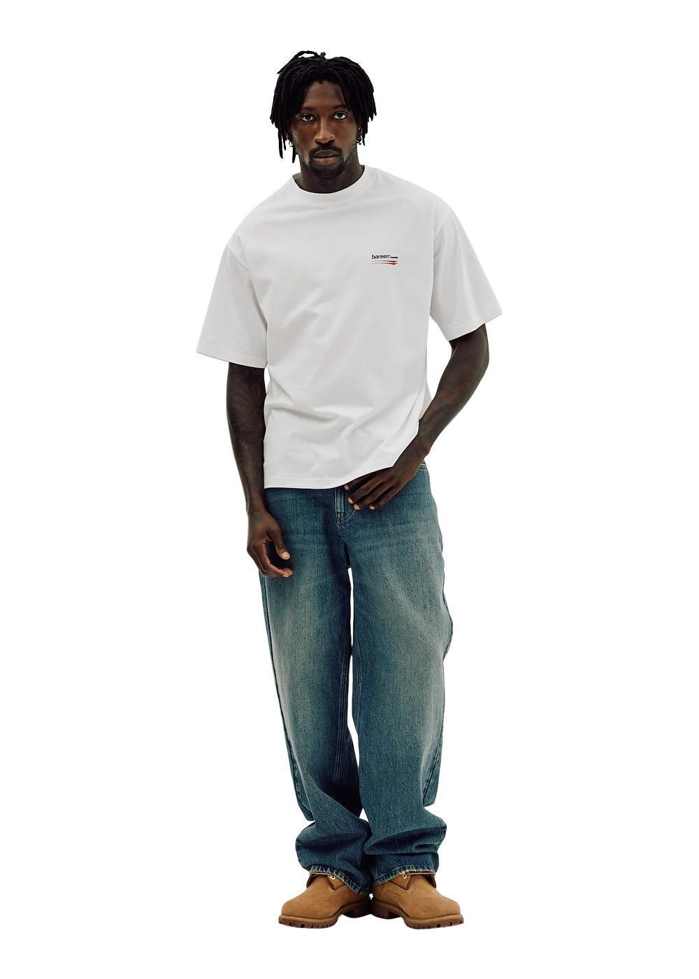 Wit T-shirt van sterke katoenkwaliteit met een boxy snit en verlaagde schouders. Het model heeft een ronde hals en is versierd met een logo op de borst en grafische prints op de achterkant in streetwear-stijl.