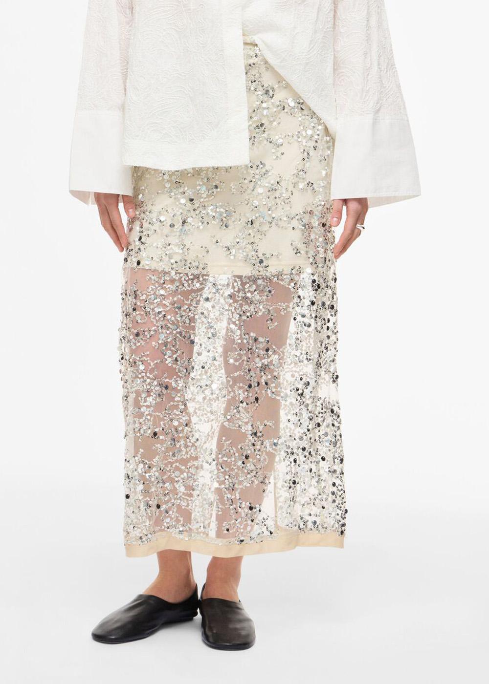 Deze beige midirok is versierd met een bloemmotief van zilveren pailletten. Het model heeft een regular fit, elastische taille en een split aan de achterkant, geschikt voor formele en feestelijke gelegenheden.