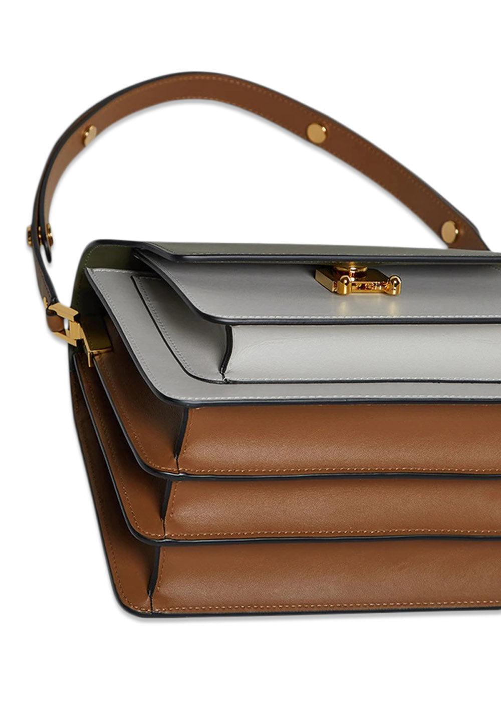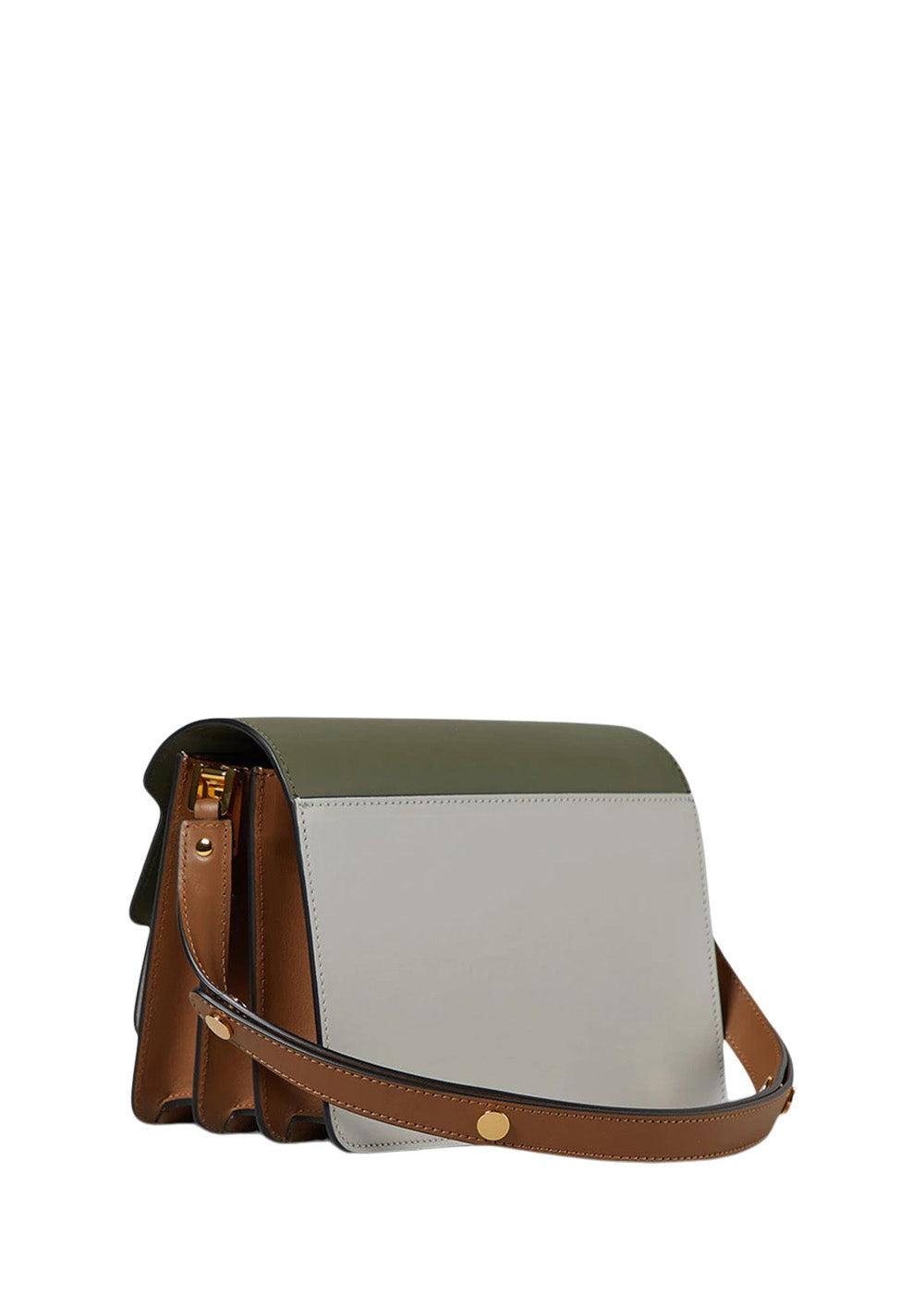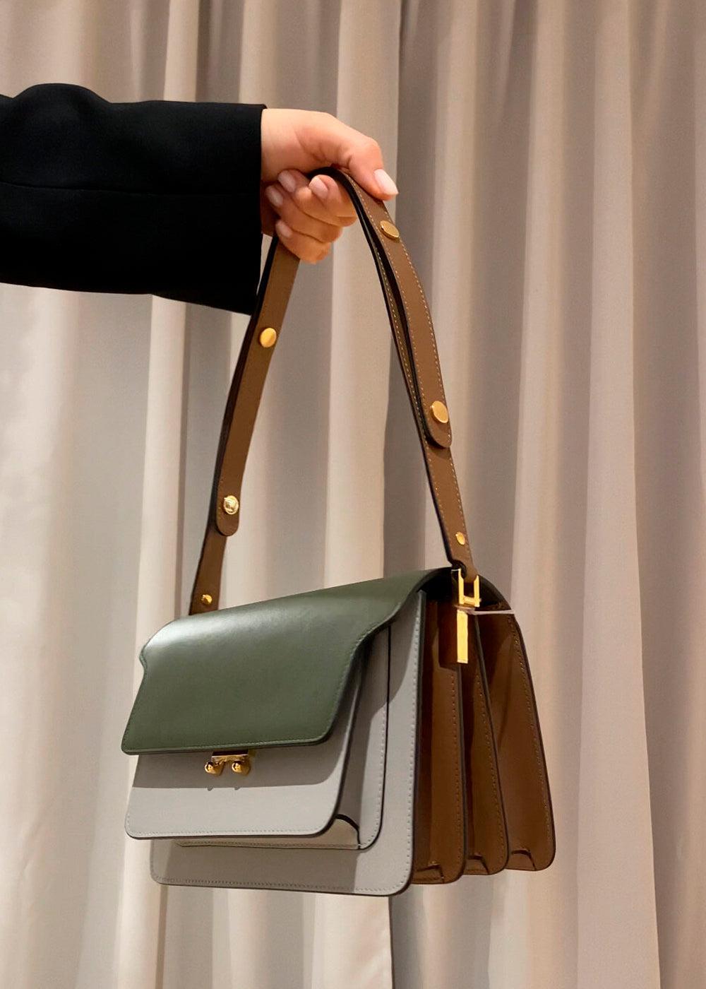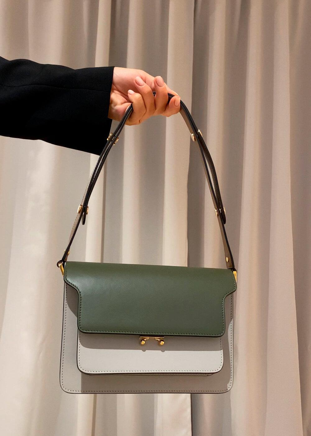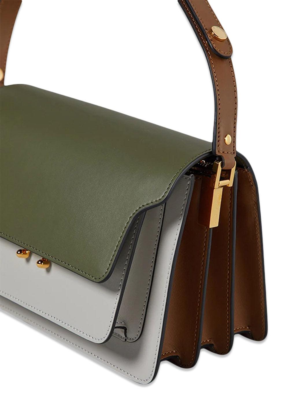 En skuldertaske er et must have i enhver kvindes garderobe. En skuldertaske fra Marni kan bruges til stort set alt og findes i mange forskellige størrelser afhængig af, hvor meget plads du har brug for. TRUNK BAG - Olive+Pelican+Goldbrown kan fuldende dit look eller være netop det item, der gør dit outfit helt unikt.