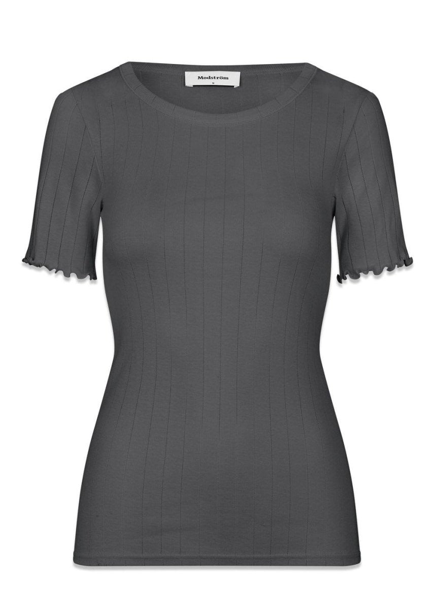 En t-shirt er både et essentielt basis item, men findes også i mange forskellige kvaliteter, former og mønstre, som kan være med til at gøre dit outfit trendy. Der findes t-shirts i forskellige print, i lækre kvaliteter og logo t-shirts fra blandt andet Soulland, Wood Wood eller Han Kjøbenhavn. Vi synes denne fra Modström er et virkelig godt valg. Brug Issy t-shirt - Rainy Grey under en blazer for et klassisk og ubesværet look, til en nederdel eller et par jeans.