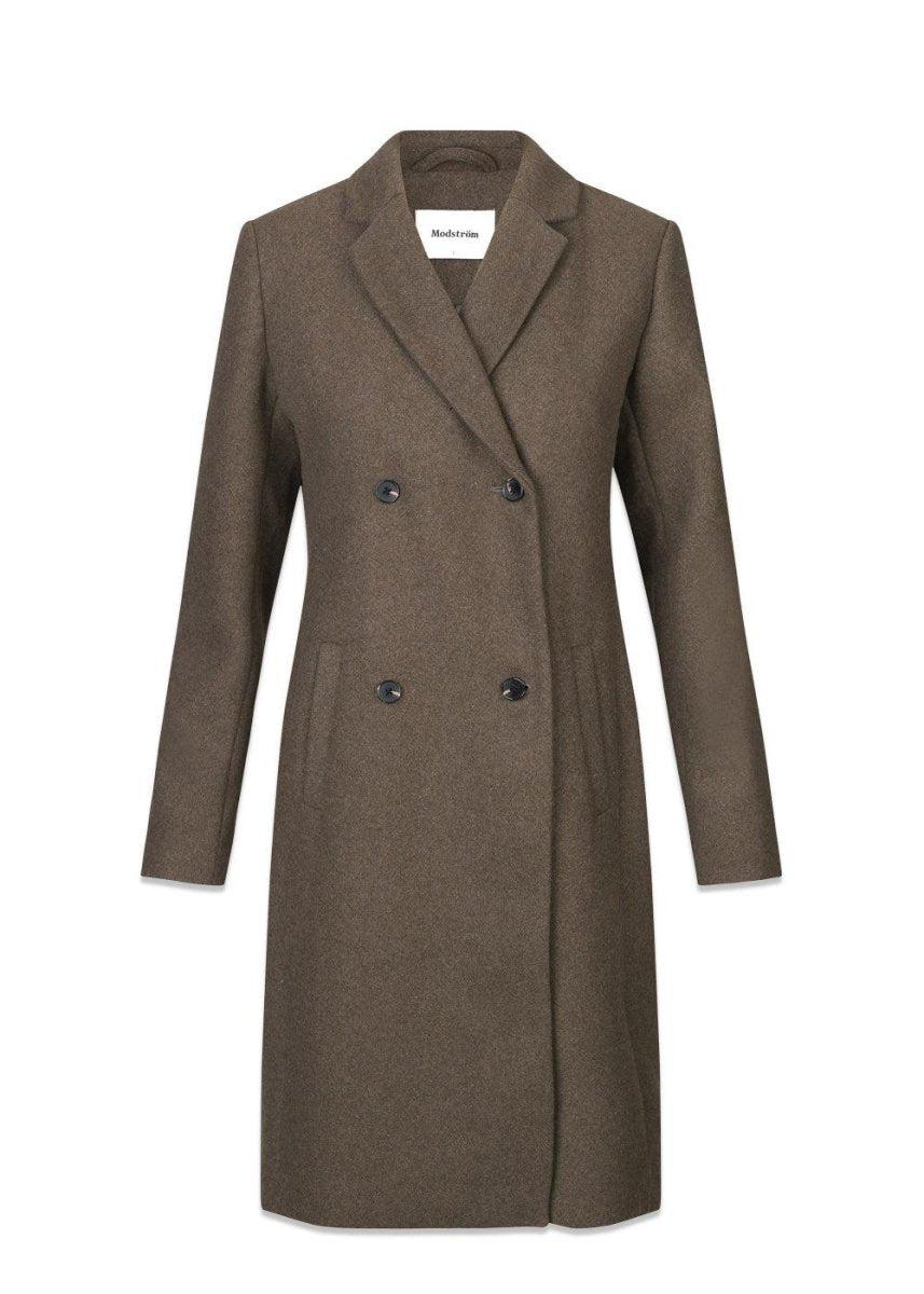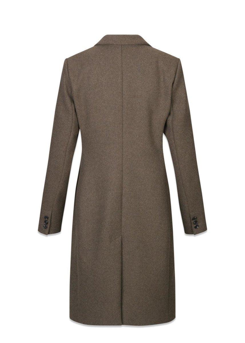 Odelia coat er en elegant uldfrakke i den flotte farve Espresso. Frakken går til knæene, har knappelukning og er taljeret, hvilket giver en virkelig fin pasform.